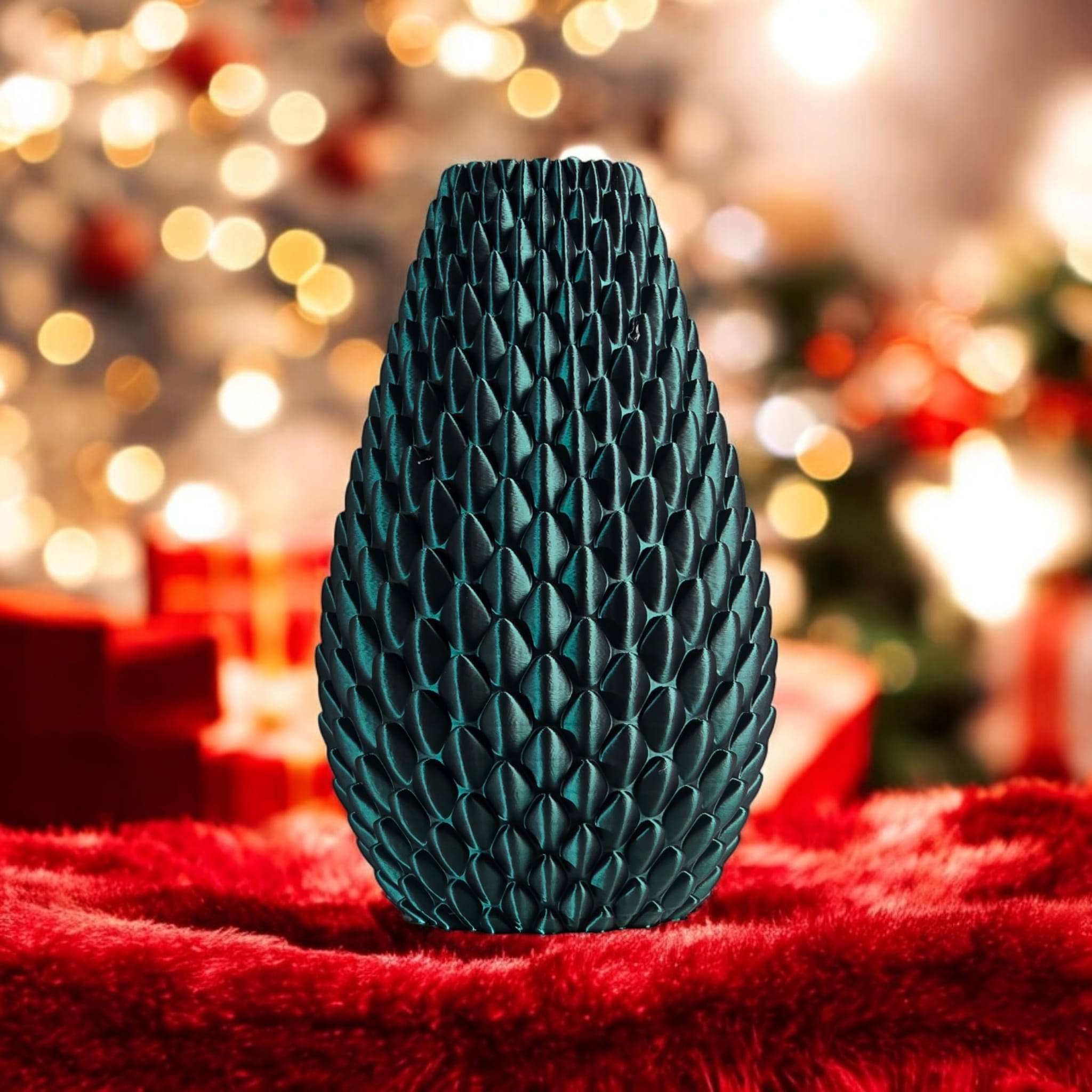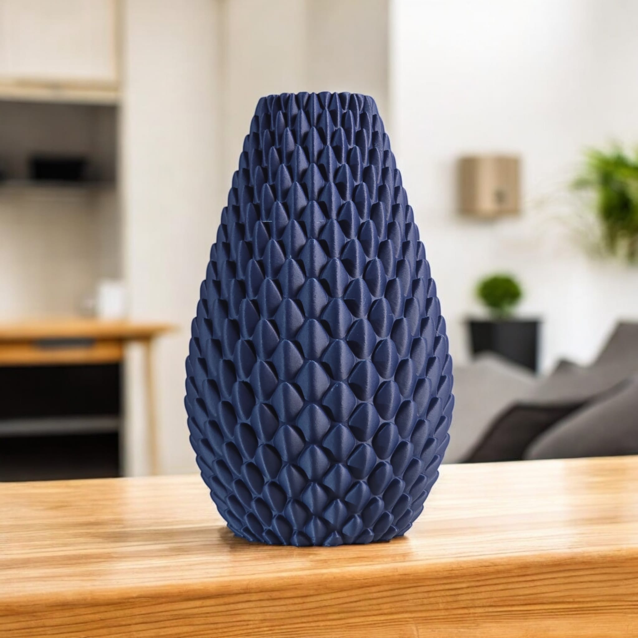 Introducing the DragonScale vase. This vase showcases a stunning textured pattern inspired by the intricate beauty of dragon scales. This 3D-printed piece combines a modern geometric design with an organic flair, making it a standout addition to any space.